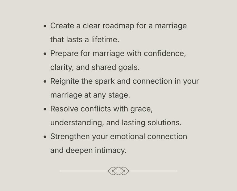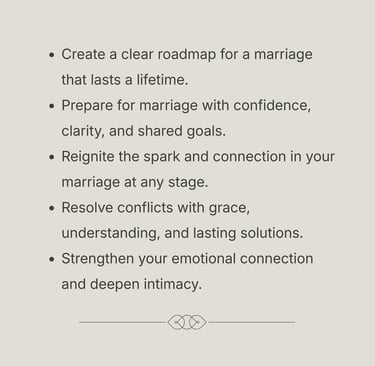 Even the strongest couples face challenges—miscommunication, conflict, and life’s unexpected stresses can create distance. Most couples don’t learn the tools to navigate these challenges before or even after marriage. That’s why having a trusted guide, a framework, and intentional coaching makes all the difference.