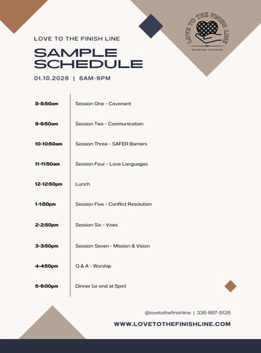Love to the Finish Line Marriage Coaching one day conference is when Nick and Amy will lead a group of people through all seven sessions of the curriculum. It can be at a church or in any group setting.